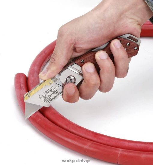 Nerūsējošā tērauda rāmja korpuss, kas pārklāts ar iegravētu koka rokturi, ergonomisks dizains.