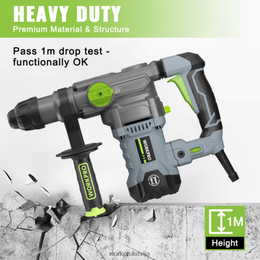 labāki instrumenti padara to par profesionālu: lieljaudas materiāls un struktūra iztur 1 m kritiena testu bez funkcionālām problēmām. Profesionāls pakāpe. Šis rotējošais āmurs nodrošina jaudīgu 12,5 ampēru motoru. 5,5 džouli trieciena enerģija ātram urbšanas un šķeldošanas ātrumam.
