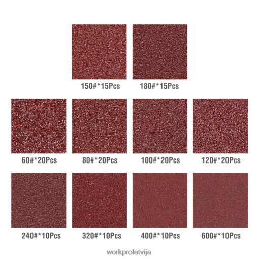 mūsu slīpēšanas disku komplekts nodrošina jums nepieciešamo vairāku smilšpapīru. Jūs iegūsit 150 kopā 10 dažādu pakāpju orbitālās slīpmašīnas, tostarp 60, 80, 100, 120, 150, 180, 240, 320, 400, 600. jo lielāks skaitlis, jo smalkāks ir smiltis.