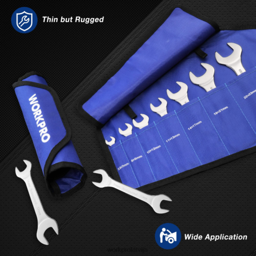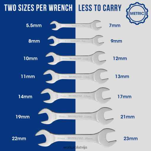 divi izmēri katrai uzgriežņu atslēgai: mazāk pārnēsājama un vieglāk atrast izmēru, metriskās uzgriežņu atslēgu komplektā ietilpst izmēri no 5,5 līdz 23 mm: 5,5, 7, 8, 9, 10, 11, 12, 13, 14, 17, 19, 21, 22, 23 mm.