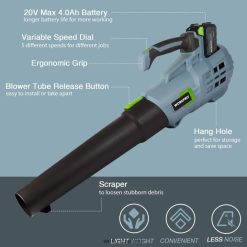 Lapu pūtējs ar 5 dažādiem ātrumiem apmierinās dažādas vajadzības. gaisa tilpums 350 cfm un gaisa ātrums 85 jūdzes stundā, lieliski piemērots lapu tīrīšanai pagalmā, dārzā un kanalizācijā.
