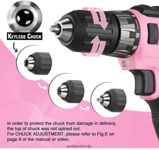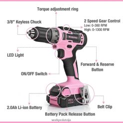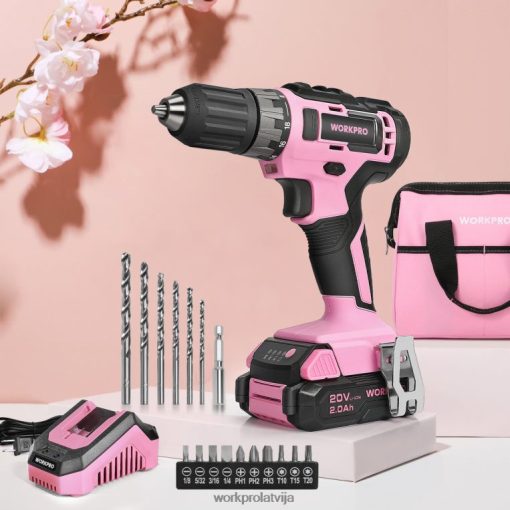 rīks rozā Iekļauts 20 v bezvadu urbjmašīnas draiveru komplekts ar ātro lādētāju un 11 collu uzglabāšanas somu WORKPRO 46XDP261