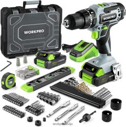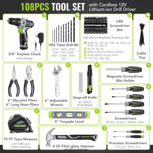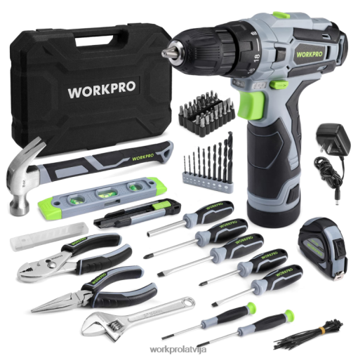 visaptverošs instrumentu komplekts ar urbi: pilnā pamata instrumentu komplektā ir iekļauti visi ikdienas lietošanai visnoderīgākie un nepieciešamākie instrumenti, tostarp skrūvgriezis un urbjmašīna, āmurs, nazis , un citi pamata rokas instrumenti.