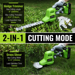 Divi vienā dizains ļauj ātri un viegli pāriet no pļaušanas uz dzīvžogu (5–1/2 collas garš krūms cirte un 3–1/2 collu plata zāles cirte). 1100 apgr./min bezslodzes ātrums spēj nodrošināt lielu jaudu, lai sasniegtu vislabākos pļaušanas rezultātus, kas ir lieliski piemēroti apgriešanai un atzarošanai: zāle, zari un krūmi. dzīvžoga apgriešanas asmeņi — vislabāk piemēroti zariem, kuru biezums ir mazāks par 7,8 mm.